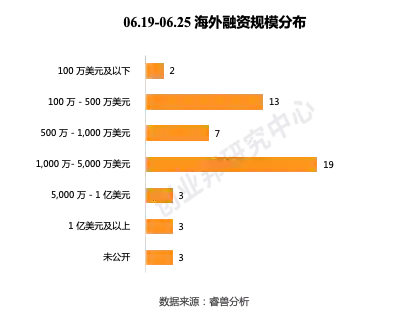 本周海外融资事件的融资规模主要集中在1,000万-5,000万美元,共19起。