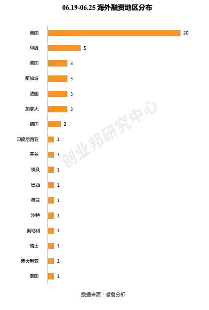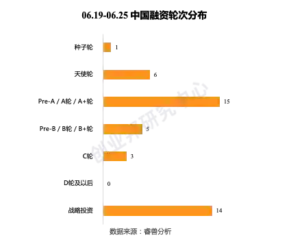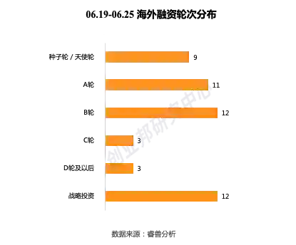本周海外融资事件的融资轮次分布主要集中在前期(种子轮、天使轮、A轮)有20起;中后期(B轮、C轮、D轮及以后)有18起;战略投资本周有12起。