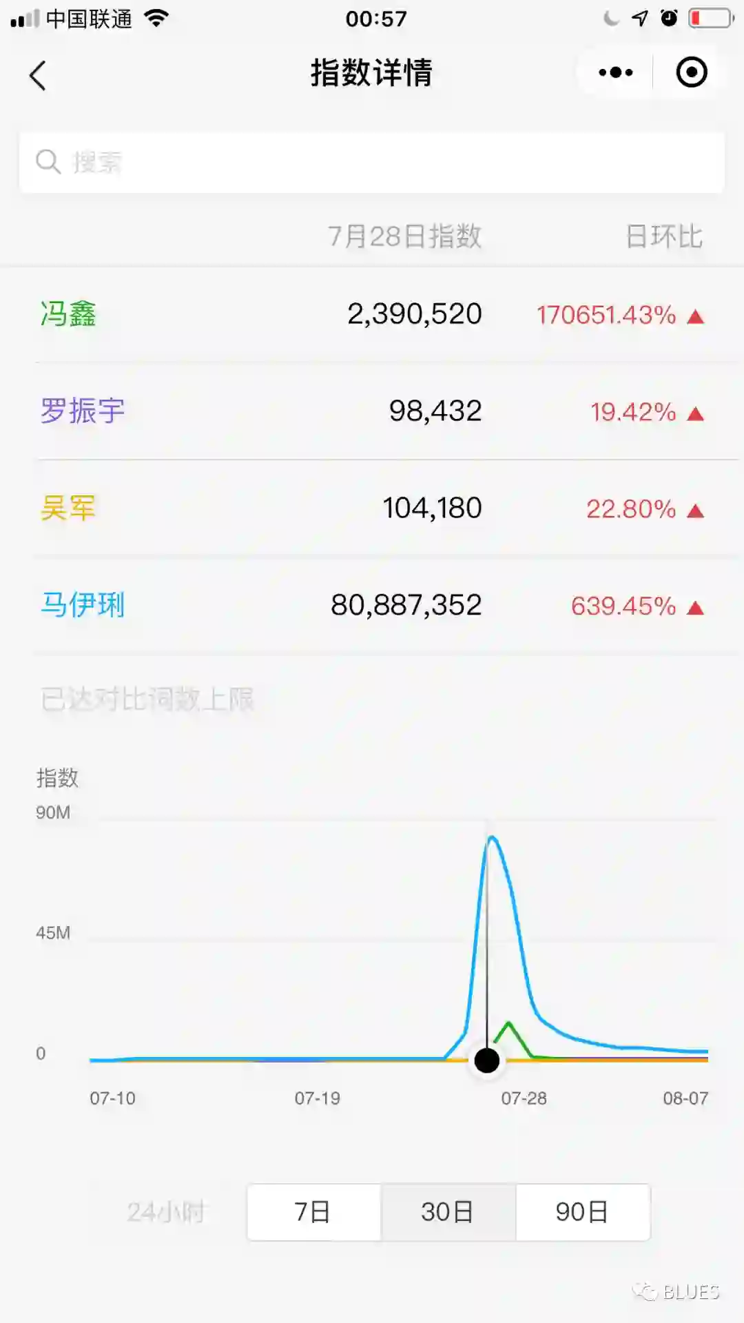 最近在我的朋友圈,有三个人很火,吴军、冯鑫、罗振宇。看下图的微信指数,8月7日,指数最高的是:罗振宇。