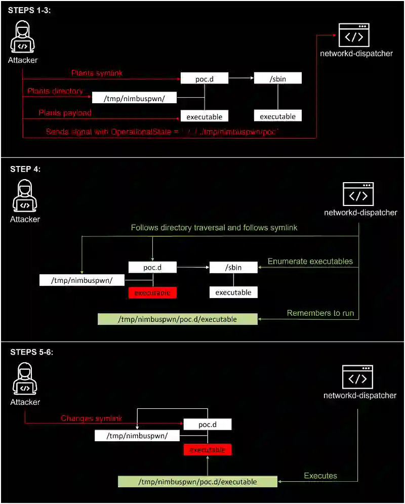 在仔细审查 networkd-dispatcher 的代码流后,微软研究人员发现其中有一个步骤为“ _run_hooks_for_state ”,它会根据检测到的网络状态运行脚本:首先,通过调用“ get_script_list ”(以字符串形式获取新状态)发现脚本列表;然后,对脚本列表进行排序;最后,使用 subprocess.Popen 运行脚本,同时提供自定义环境变量。