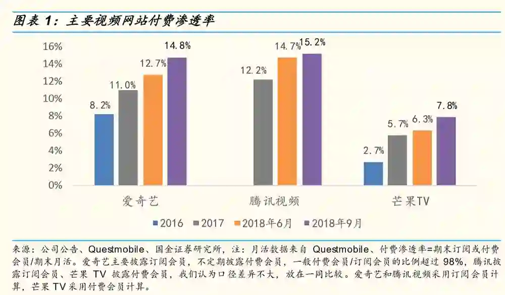 国金证券近日发布的报告《视频龙头即将进入“过亿会员”后时代展望》称,爱奇艺和腾讯在2019年上半年付费会员数将超过1亿,两家的付费渗透率在2018年均维持在15%左右。