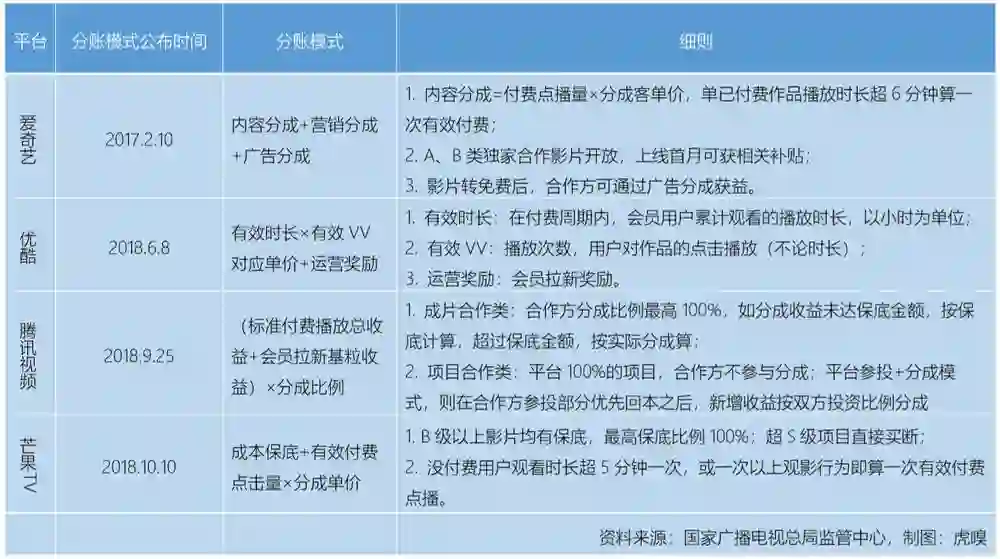 图5:主流视频网站网络大电影分账与分成标准
