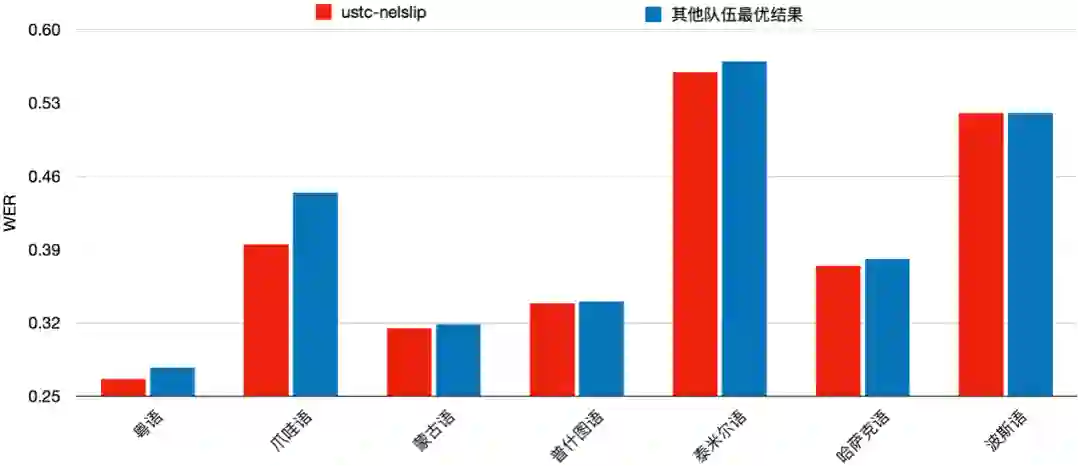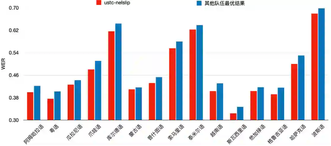在另一个更加关注小语种语音技术的OpenASR比赛中,科大讯飞-中科大语音及语言信息处理国家工程实验室(USTC-NELSLIP)联合团队参加了所有15个语种受限赛道和7个语种非受限赛道,并全部取得第一名的成绩。