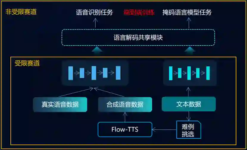 文本掩码语言模型任务、合成数据语音识别两个目标,两个任务联合训练以充分利用海量无监督文本;