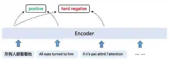 在上图的例子中,对于源语言(中文)中的句子A「所有人都看着他」,以英文中的同义句B「All eyes turned to him」为正样本,法语中的反义句C「Il n'a pas attiré l'attention」为高难度负样本,其他句子作为普通负样本训练模型,达到让模型习得跨语言理解句子语义的目的。