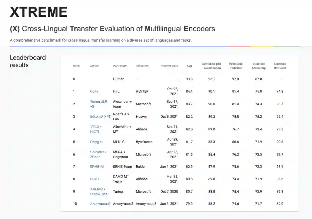 先是在世界权威多语言理解评测XTREME中,哈工大讯飞联合实验室(HFL)团队以总平均分84.1分位列榜首,刷新世界纪录。