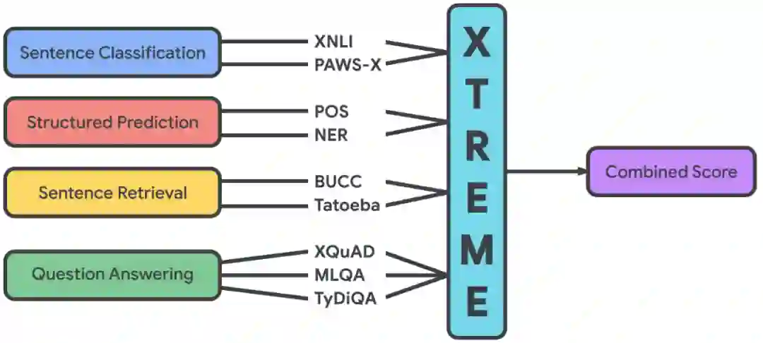 具体而言,XTREME涵盖了12个语系的40种语言,包括对不同层次的语法或语义进行推理的4大类9个任务: