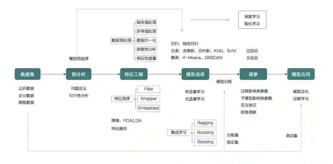 其实我们学习整体的框架就基于这个流程,其中涉及到大量算法原理及使用、模型选择思路、特征工程、集成学习等等内容,这是一个完整的机器学习实践流程。