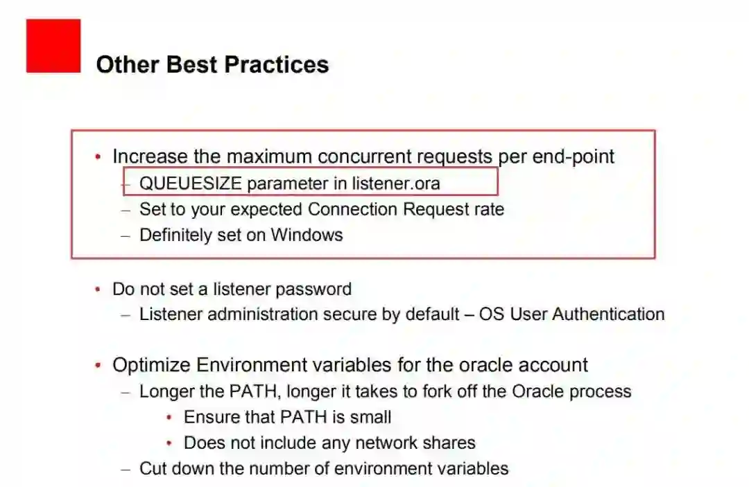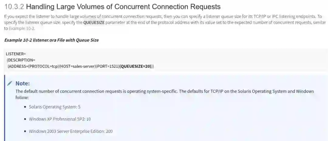第二种是在监听中增加QUEUESIZE参数,QUEUESIZE参数是指监听器在建立连接时可以存储的并发连接请求数。如果传入请求数超过缓冲区大小,则请求连接的客户端将接收失败。在比较理想的情况下,此缓冲区大小应该等于或者大于预期并发请求的最大数量。Oracle官方文档也提到了这个参数适用于处理大量并发连接的请求。