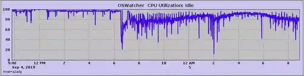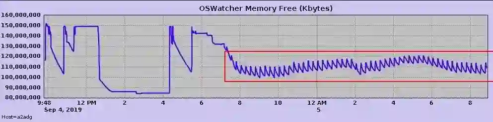 正常运行的Oracle软件不会出现这么多trace,于是怀疑是Oracle 11gR2软件和Centos 7.5版本存在兼容性问题(主库是Centos 6和Oracle 11g),通过使用另外的一套机器RedHat6搭建了一套新的11g adg环境后,彻底解决了半夜宕机的问题。通过OSWatch可以发现内存的波动是相对稳定的。
