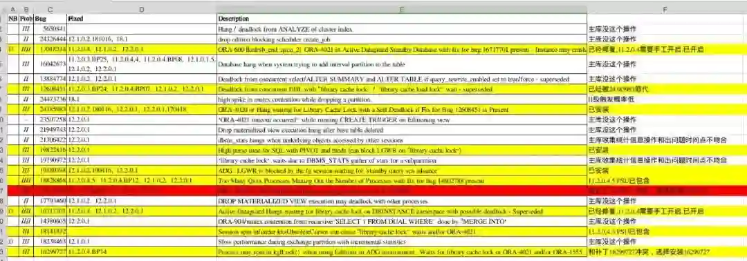 针对在ADG数据库上出现的library cache lock,我们做了单独的补丁分析,参考了文档WAITEVENT: "library cache lock" Reference Note (Doc ID 34578.1),如下excel列表所示,相关和容易触发问题的补丁都做了安装。
