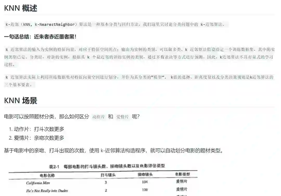 以第2章KNN邻近算法为例,正文内容大致是这个样子的: