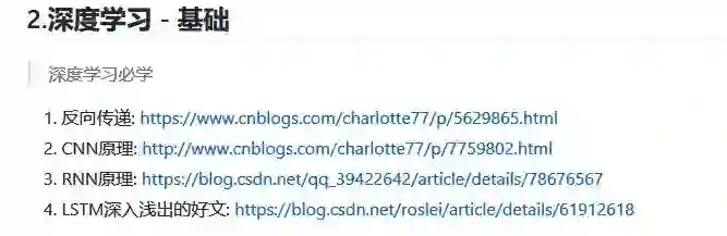在第二部分深度学习基础中,扩展了反向传播、CNN原理、RNN原理和LSTM四个知识点,并逐个附加了一篇介绍博文