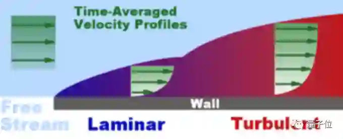 例如,匀速运动的流体在经过一面墙壁后,会先形成一层稳定的层流边界层(图中蓝色部分),再形成湍流边界层(图中红色部分)。