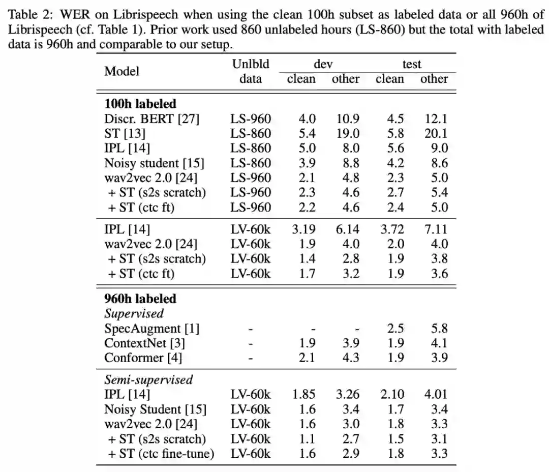 至于自训练,研究人员使用基于不同标注数据设置微调过的 wav2vec 2.0 LARGE 模型对 LS-960 或 LV-60k 音频数据执行伪标注。
