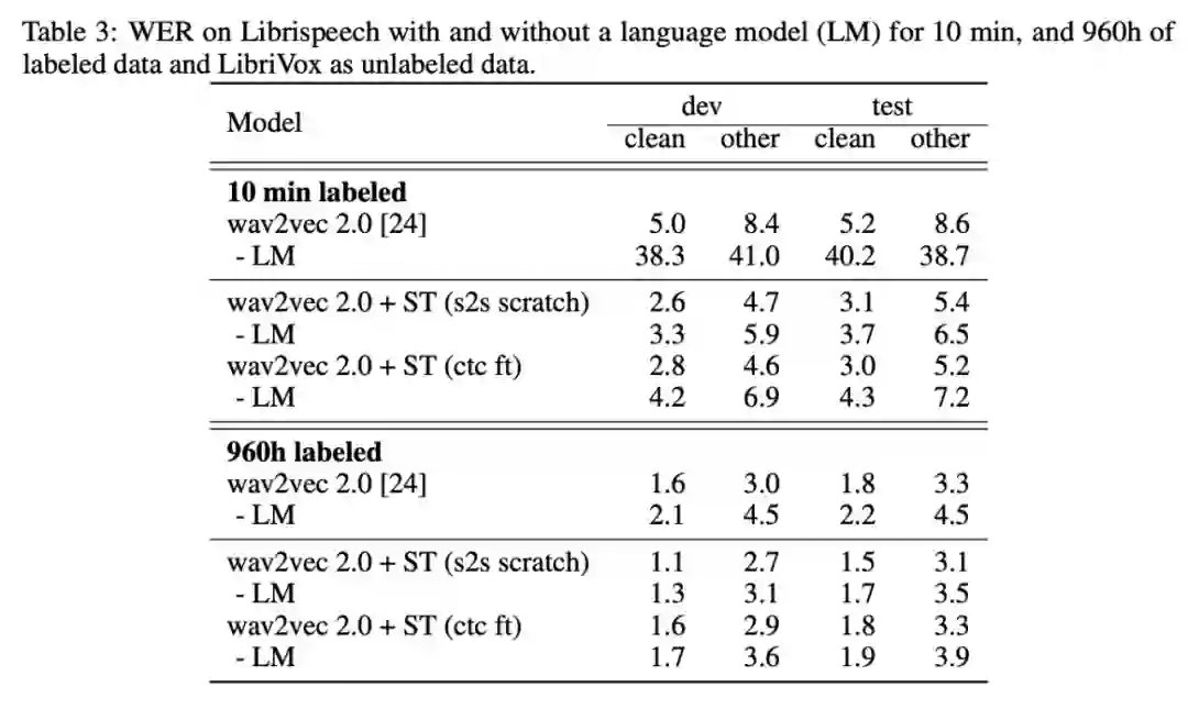 下表 3 展示了,在没有语言模型的情况下,自训练和预训练的结合仍能取得不错的性能。这是因为伪标注过程中使用的语言模型已被部分融入伪标注数据中。在没有语言模型的 10 min labeled 设置下这一效应尤其显著:在 test-other 数据集上,wav2vec 2.0 + ST (s2s scratch) 将基线方法 (wav2vec 2.0 - LM) 的词错率降低了 83%。