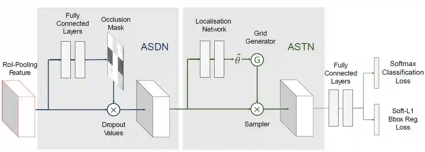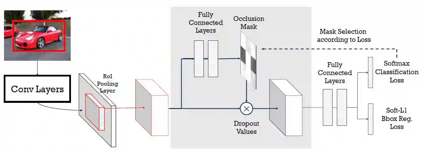 图 2:该方法的 ASDN 网络架构以及如何与 Fast RCNN 结合的示意图。我们的 ASDN 网络使用输入图片加入 RoI 池化层中得到的补丁。ASDN 网络预测遮挡/极高光蒙版,然后将其用于丢弃特征值,并传递到 Fast-RCNN 分类塔。