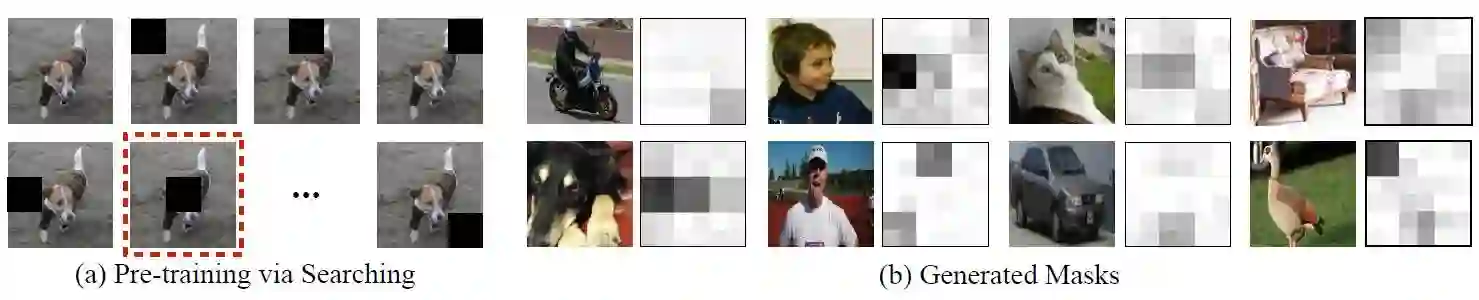 图 3:(a)模型预训练——寻找难度最高的遮挡用于训练 ASDN 网络。(b)ASDN 网络生成的遮挡蒙版事例,黑色区域在通过 FRCN 管道时被遮挡。