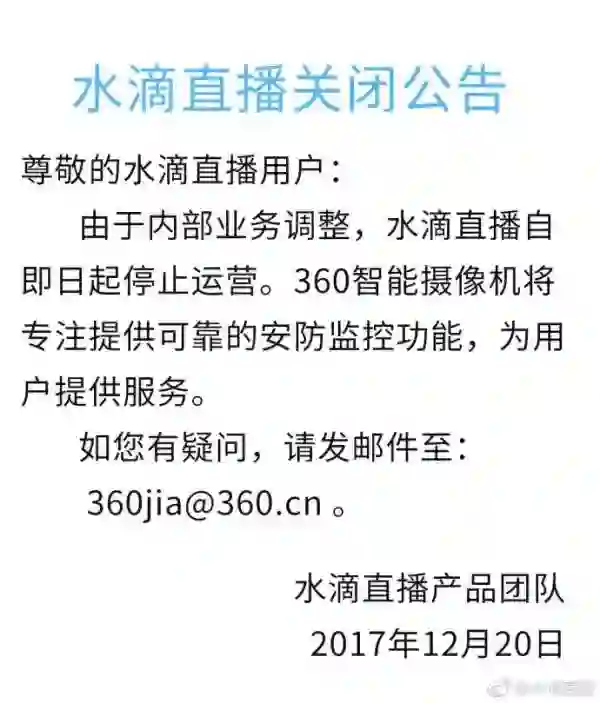 12月20日,360公司宣布主动、永久关闭水滴直播平台。水滴直播相关负责人表示,水滴直播本身是一个响应用户需求而出现的创新产品,在这个过程中,水滴直播平台的一些功能存在争议,也存在被恶意利用的可能。
