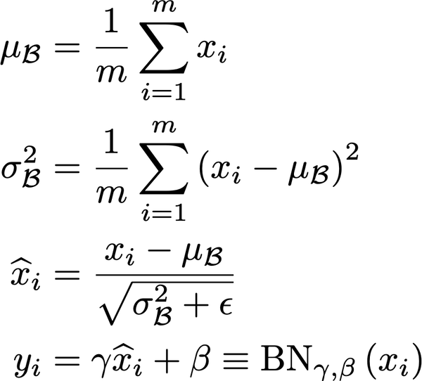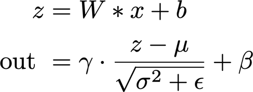 用一点数学知识,我们可以很容易地重新对卷积进行排列来处理batch normalization。提醒一下,对一个输入_x_进行卷积之后再进行batch normalization的运算可以表示为:那么,如果我们重新排列卷积的W和b,考虑batch normalization的参数,如下: