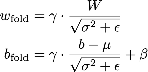 一旦训练结束,每个Batch normalization层都拥有一组特定的γ和β,还有μ和σ,后者在训练过程中使用指数加权平均值进行计算。这意味着在推理过程中,Batch normalization就像是对上一层(通常是卷积)的结果进行简单的线性转换。由于卷积也是一个线性变换,这也意味着这两个操作可以合并成一个单一的线性变换!这将删除一些不必要的参数,但也会减少推理时要执行的操作数量。