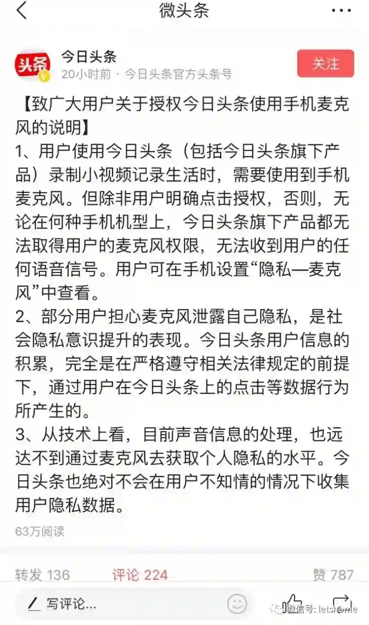 今日头条在回应中也提到,有的用户在录制视频时确实会使用手机麦克风的权限,苹果建议用户设置成仅在使用期间开放权限。