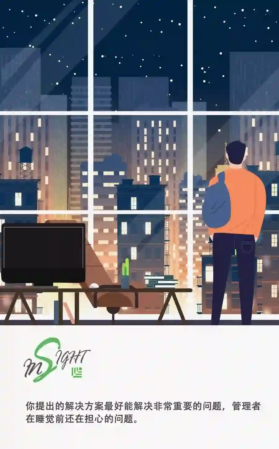 所以你提出的解决方案最好能解决非常重要的问题,管理者在睡觉前还在担心的问题。最好他们的分红计划与此有关。