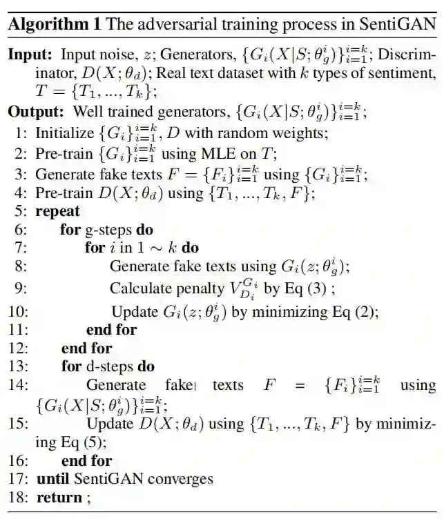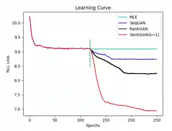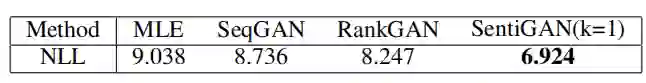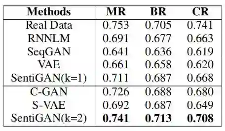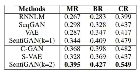 我们提出的 SentiGAN 解决了上述问题。首先,我们提出新的目标函数,通过最小化整体损失而不是最大化奖励来优化模型。其次,判别器使用多类别分类目标函数,可以让生成器更关注于生成他们情感标签的样本,而不与其他标签混淆,这一点提高了生成文本的情感准确性。我们使用一个情感分类器作为评价方法,来验证生成文本的情感准确度,以及其他指标(流畅度、新颖度、多样性、智能性)。