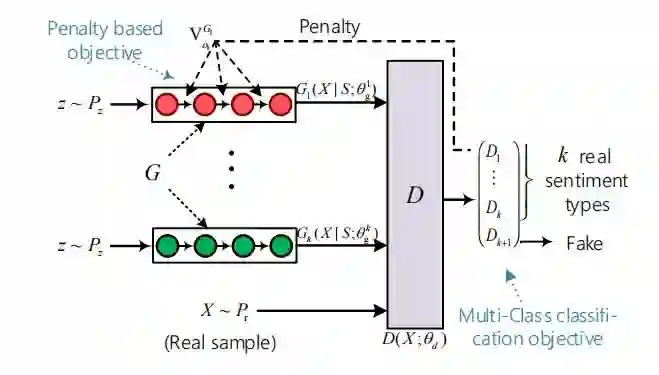图 1 SentiGAN,由 k 个生成器和一个多类别判别器。