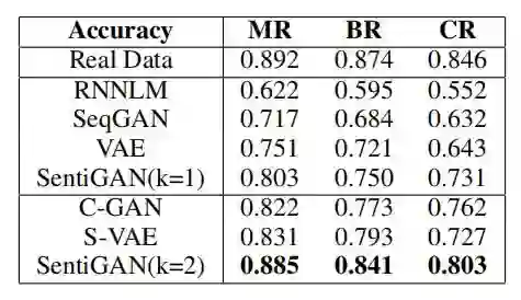我们使用先进的情感分类器来自动评价生成文本的情感准确度。我们与多个文本生成网络进行比较,包括 RNNLM、SeqGAN、VAE、C-GAN 和 S-VAE。为了说明用多个生成器和单个生成器的区别,我们也对比了 SentiGAN(k=1)。