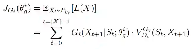 由于判别器只能鉴别一个完整的句子,因此我们采用蒙特卡洛搜索和 roll-out 策略对剩下的 X-t 个未知单词进行采样。因此,我们的第 i 个生成器的惩罚函数计算如下: