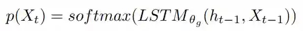 除此之外,我们的生成器是 LSTM 的简化层,根据如下分布生成第 t 个单词: