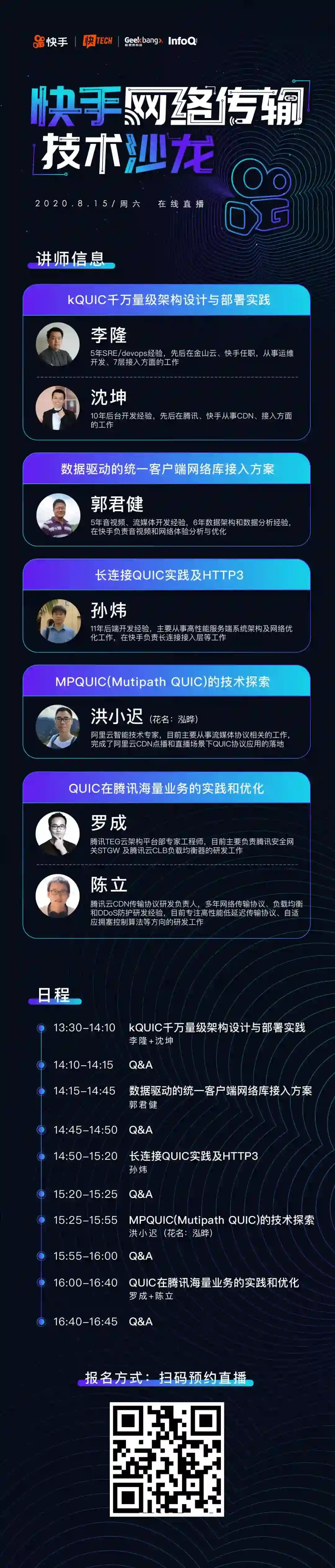 8 月 15 日,「快手网络传输技术沙龙」将如期举行,届时快手联合阿里云与腾讯云数位大咖,从 QUIC 协议发展趋势到技术的落地应用,全方位分析新一代网络传输技术的标准化方向。同时,快手为广大前端小伙伴带来了基于 QUIC 协议,自研的高性能服务器 kQUIC 解析,给于短视频 + 直播领域的开发者提供了丰富的应用经验与参考建议。