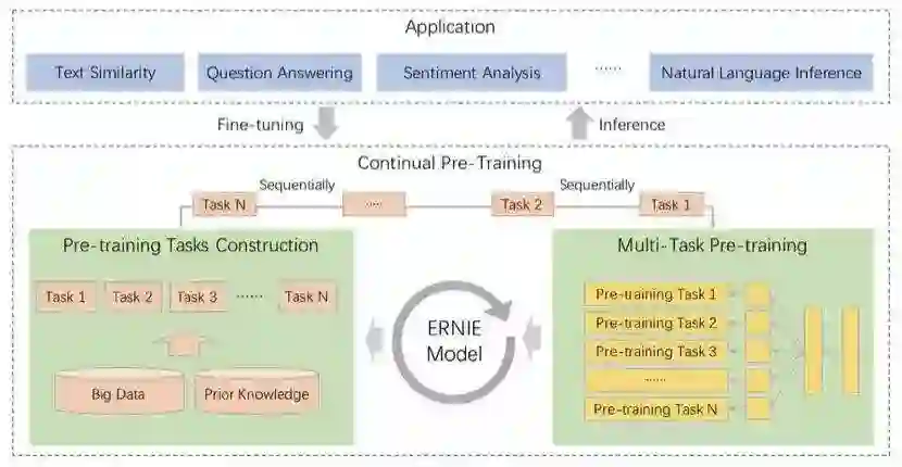 该框架支持增量引入词汇 (lexical)、语法 (syntactic) 、语义 (semantic) 等 3 个层次的自定义预训练任务,能够全面捕捉训练语料中的词法、语法、语义等潜在信息。这些任务通过多任务学习对模型进行训练更新,每当引入新任务时,该框架可在学习该任务的同时,不遗忘之前学到过的信息。这也意味着,该框架可以通过持续构建训练包含词法、句法、语义等预训练任务,持续提升模型效果。
