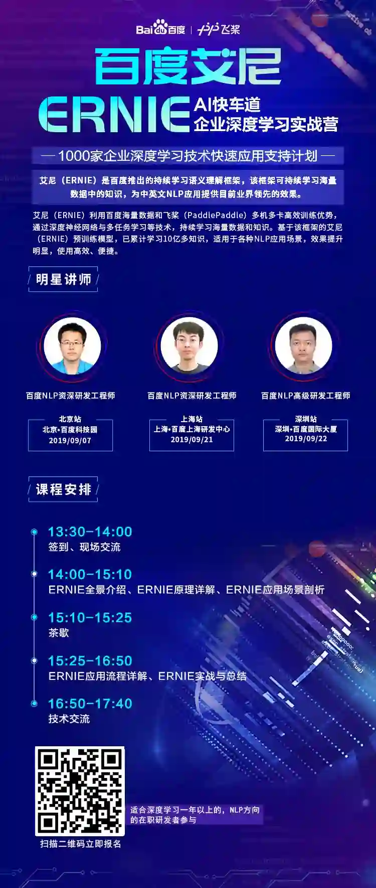 9 月 21 日上海·百度上海研发中心,9 月 22 日深圳·百度国际大厦,百度 AI 快车道——百度艾尼(ERNIE)即将开课,课程将围绕持续学习语义理解框架 ERNIE 的详解和实战应用进行。来自百度的明星讲师,将给大家详细讲解 ERNIE 的实现原理、优势以及在真实场景中的应用案例,并通过现场实践和交流环节,让大家能在真实应用中快速用 ERNIE 取得更好效果!