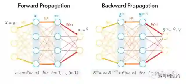 图 6. Neural network during training: Forward propagation (left) to Backward propagation (right).
