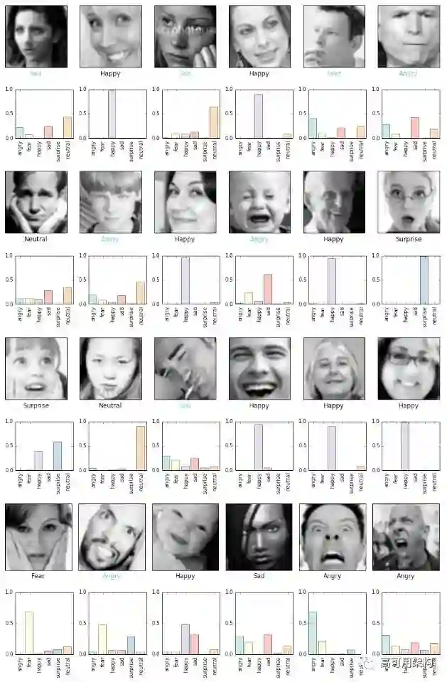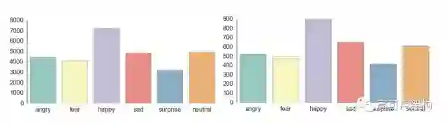 当作者分析语料数据集时,发现“disgust”分类相对于其它分类不均衡(只有113 张样本)。作者将两类相似的情感(disgust 和 anger)合并起来。为了防止数据倾斜,作者构建一个数据生成器 fer2013datagen.py [1],该生成器很容易分割训练集和保留数据集。本例使用 28709 张面部图片作为训练集,余下的图片作为测试集和验证集(每个数据集 3589 张)。这样我们获得了 6 类均衡的数据集,见图2,包含 happy, sad, surprise, fear, anger, and neutral。
