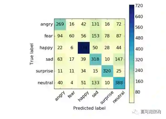 仔细看下每个表情的预测结果。图 9 是测试集的模型预测的混淆矩阵。矩阵给出表情预测的数量和多分类模型的效果展示: