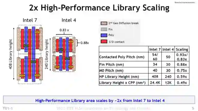 根据消息,Intel 4 相较于 Intel 7(12 代酷睿所采用的 10nm 制程),同等功耗下的频率可以高出 20%。从英特尔公布的指标数据来看,有些尺寸参数甚至缩小了一半多。