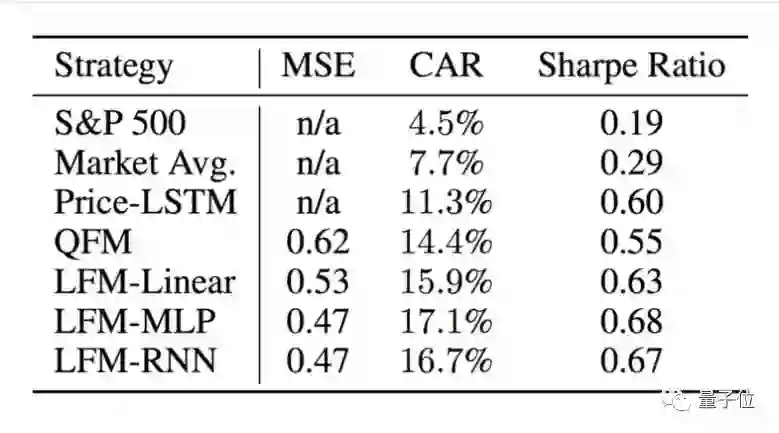 今年NIPS顶会上,Alberg和Lipton分享了他们的一篇论文,Improving Factor-Based Quantitative Investing by Forecasting Company Fundamentals。这篇论文指出,他们研发的选股AI(下图的LFM-MLP策略)在测试阶段,就产生了17.1%的年化率,而标准的数据模型(下图的QFM,quantitative factor model,传统的计量经济模型)只能达到14.4%。