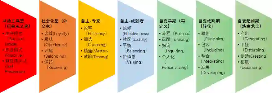 这符合心智发展的内在规律:从自主-专家(“专家”)到自主-成就者(“组织者”),从自变早期(“甩手掌柜”)到自变成熟期(“文化教员”和“轮值主席”),最后发展成出自变超越状态(“众人和制度”)。