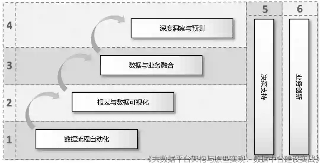 最后,在成熟度模型图的右侧,还有两个贯穿始终的维度:决策支持与业务创新,它们既是企业构建数据平台进行数据分析的价值导向,也是企业数据应用能力持续输出的效果,企业达到的层级越高,对于决策支持与业务创新起到的支撑作用就越大越明显。