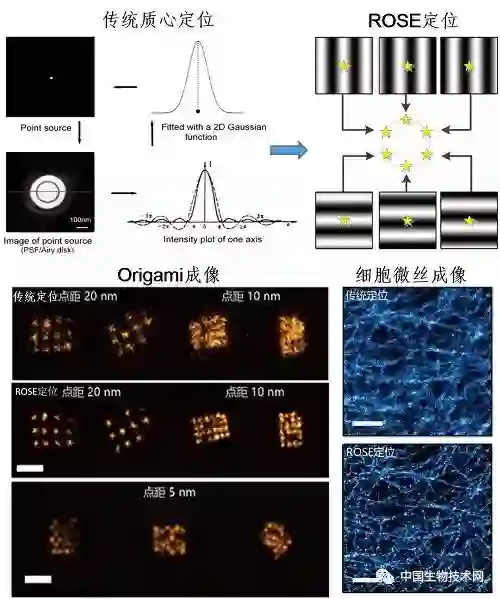 9月9日,Nature Methods 杂志在线发表了中国科学院院士、中国科学院生物物理研究所研究员徐涛研究组与科学研究平台正高级工程师纪伟研发团队合作的研究论文,题为Molecular resolution imaging by repetitive optical selective exposure,为超高分辨光学显微镜家族再添新成员,使显微镜分辨率进一步被突破。 该工作提出了一种基于激光干涉条纹定位成像的新技术,并据此研制出新型单分子干涉定位显微镜(Repetitive Optical Selective Exposure, ROSE),将荧光显微镜分辨率提升至3 nm以内的分子尺度,单分子定位精度接近1 nm,可以分辨点距为5 nm的DNA origami(DNA 折纸)结构。