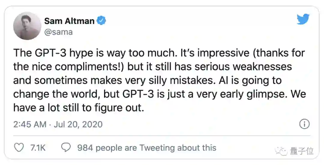的确,疯狂的鼓吹情绪变得如此强烈,以至于OpenAI CEO本人都发Twitter说:GPT-3被过度宣传了。