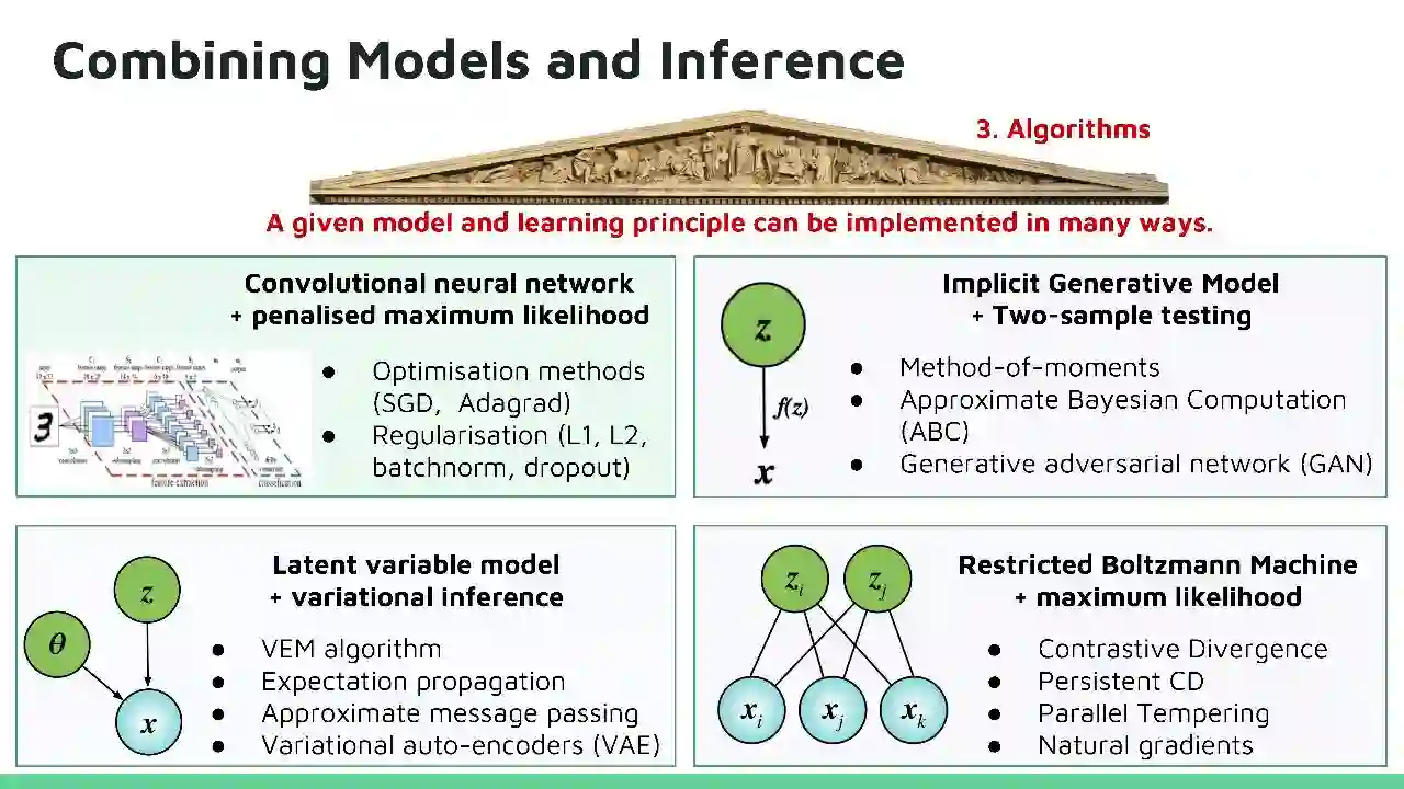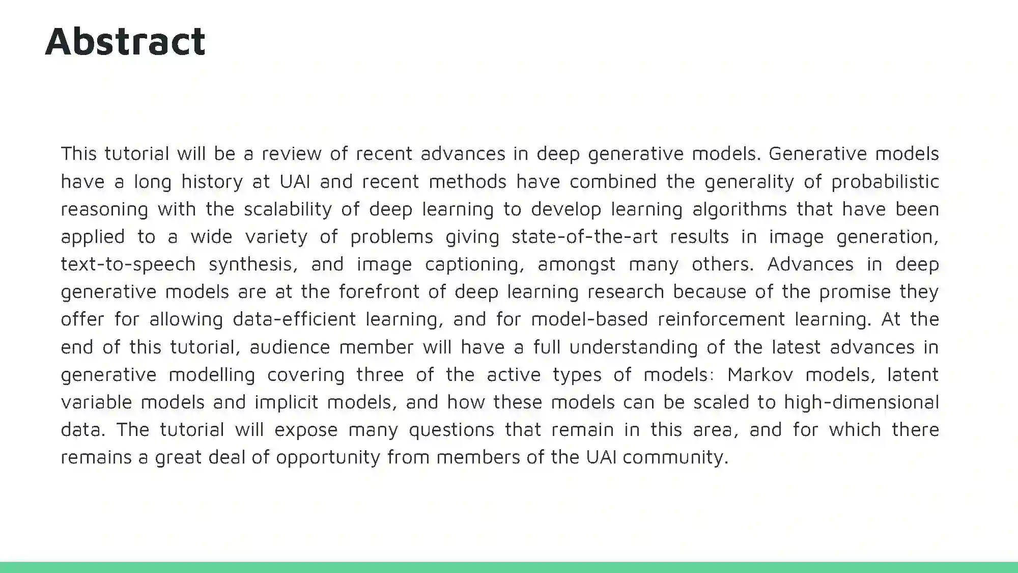 本教程将回顾深度生成模型的最新进展。生成模型在人工智能不确定(Uncertainty in Artificial Intelligence, UAI)研究方面有着悠久的历史,近期的方法尝试将概率推理的普遍性与深度学习的可扩展性相结合来开发新的深度学习算法,这些算法已经在很多问题上得到广泛应用,并在图像生成、语音合成和图像字幕等方面获得领先的结果。目前深度生成模型的研究处于深度学习研究的前沿地带,因为它高效数据学习和基于模型强化学习方面有着天然的优势。在本教程中,观众将对生成模型的最新进展有全面了解,其中包括三种最活跃模型:马尔可夫模型(Markov models,)、隐变量模型(latent variable models)和隐式模型(implicit models),以及如何将这些模型扩展到高维数据。本教程还揭示这个领域仍然存在的许多问题,所以在UAI领域还有有很多研究机会。