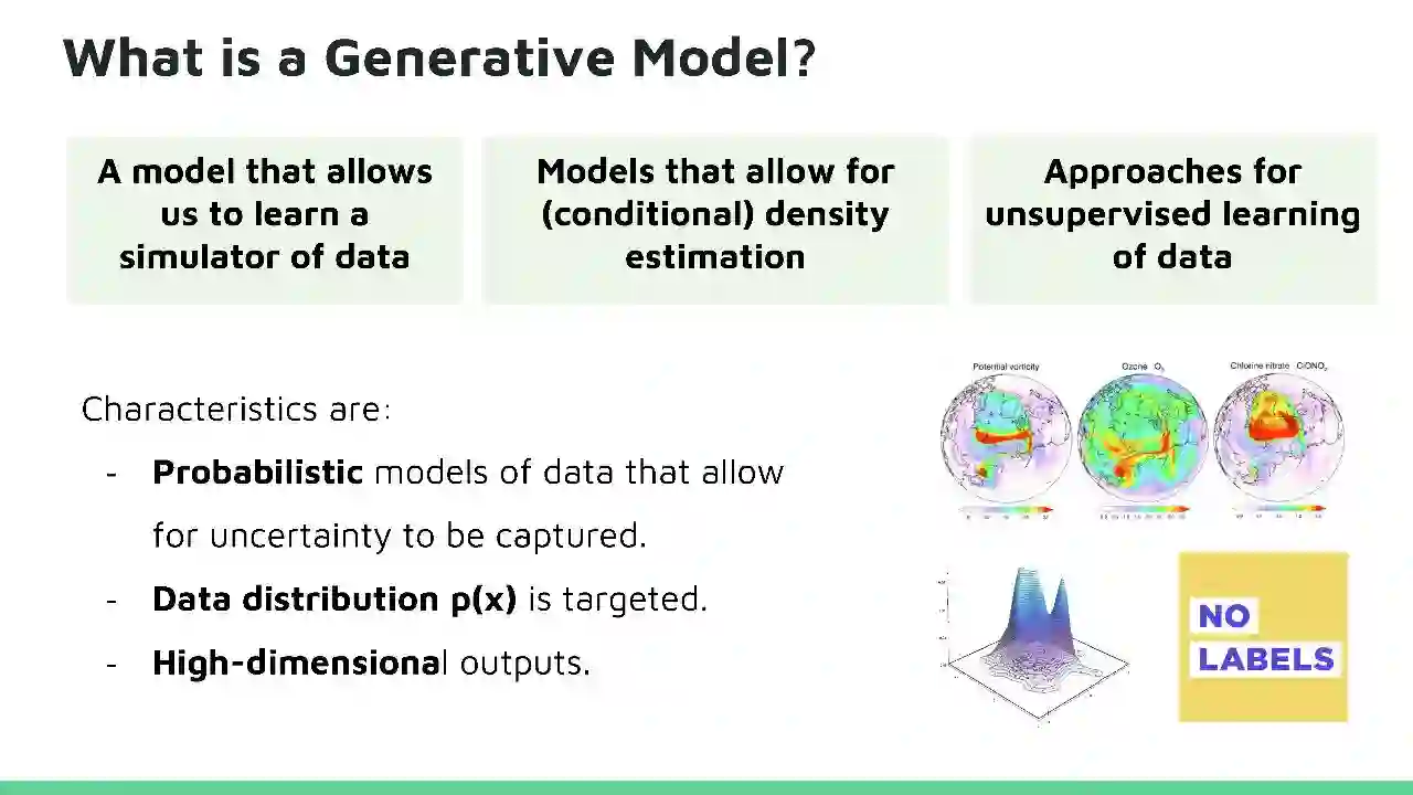生成模型(Generative Model)是概率统计和机器学习中的一个概念,指 一系列用于随机生成可观测数据的模型。在机器学习中,生成模型是非常重要的模型,既可以用在无监督学习中,也 可以用在有监督学习中。在无监督学习中,生成模型可以直接建模一些观测数 据的概率密度函数,比如高斯混合模型。在有监督学习中,生成模型可以计算 条件概率密度函数,作为计算类别后验概率的中间步骤,然后通过贝叶斯规则 可以从生成模型中得到条件分布,比如朴素贝叶斯分类器。本教程将涵盖这些主要内容。
