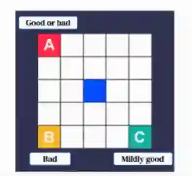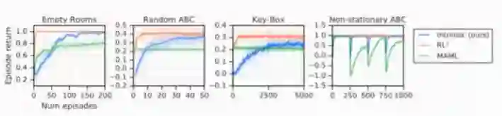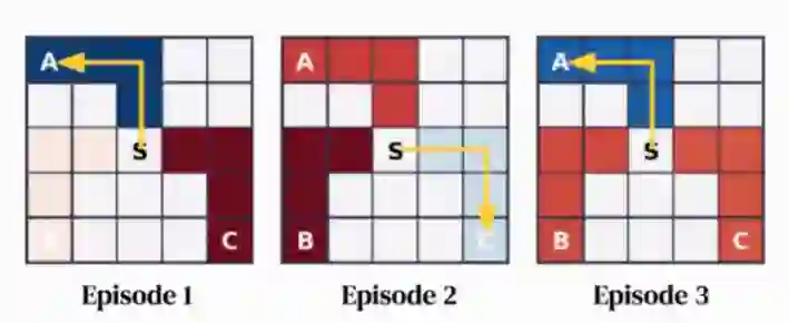 在这个实验中,我们希望学习到内在奖励函数可以捕获到的规律是:规避B,因为它总是不好的,同时可以快速的指出A和C到底哪个更好,并在剩下的生命周期内总是做出最好的选择。为了学到这些规律,智能体需要跨多个Episode进行探索学习。图8展示了不同的Episode中探索到的Object,图中每个方格代表每个轨迹中积累的内在奖励,蓝色代表正的奖励,红色代表负的奖励。可以看到在Episode 1中,推荐Object A,在Episode 2中推荐Object C,在Episode 3中推荐Object A,整个过程中都没有推荐Object B,它的颜色总是红的。