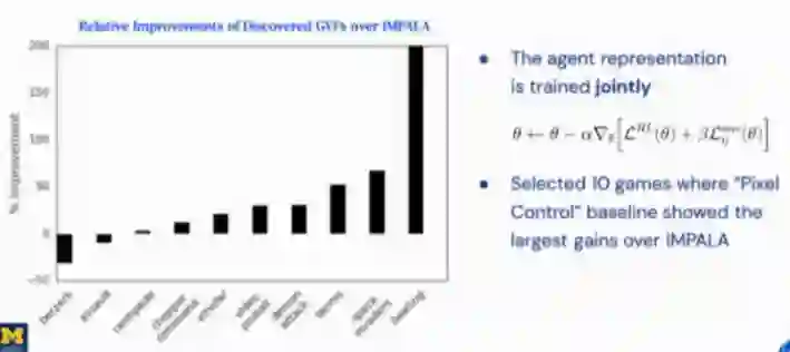 针对于如何在数据中发现问题作为辅助任务,他扩展通用辅助任务架构,参数化表示General Value Functions,并通过Meta-Gradient方法学习更新参数发现问题。实验证明这个方法可以快速发现问题来提高强化学习效果。