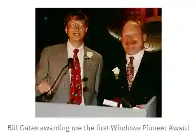 1994年5月,在亚特兰大举行的Windows世界大会上,比尔·盖茨颁发了7个Windows先锋奖,其中一个奖项是为了表彰我成功创建了Visual Basic。我感到非常的荣幸!