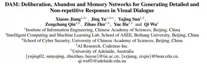 本文介绍的是 IJCAI-2020论文《DAM: Deliberation,Abandon and Memory Networks for Generating Detailed and Non-repetitiveResponses in Visual Dialogue》,该论文由中科院信工所于静老师指导,由来自中科院信工所、北京航空航天大学、阿德莱德大学的作者(蒋萧泽、于静、孙雅静、秦曾昌、朱梓豪、胡玥、吴琦)共同合作完成。